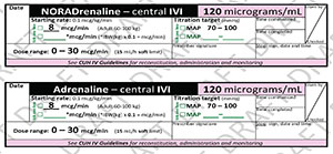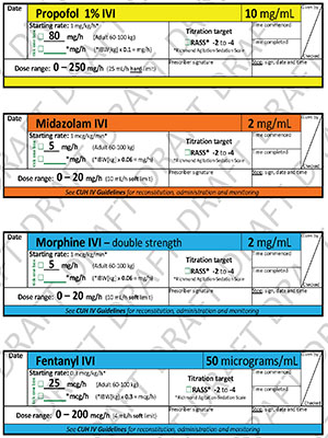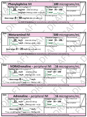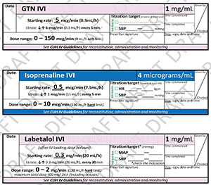 All these medications are for careful titration at the bedside until clinical stability is achieved, they are not 'set and forget'. The stickers are designed to increase efficiency and reduce delay/ distraction, whilst also providing key clinical guidance.